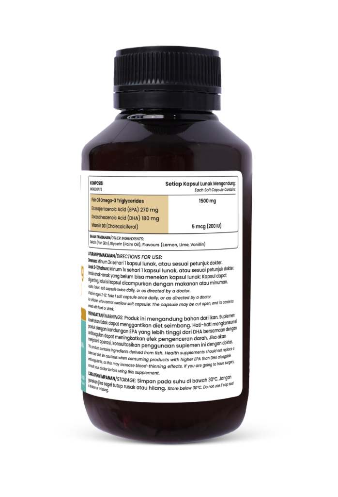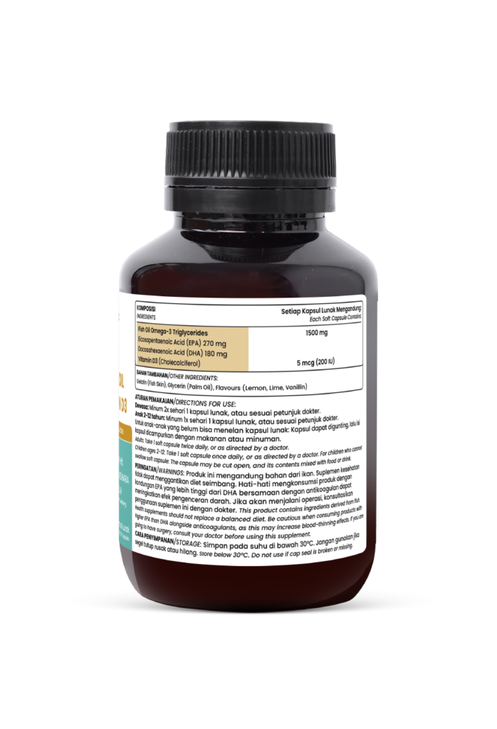Kombinasi omega-3 dan vitamin D3 dalam suplemen ini memberikan manfaat luar biasa bagi kesehatan jantung, otak, dan tulang. Omega-3 membantu menjaga kadar kolesterol normal, mendukung fungsi otak, serta melindungi kesehatan mata, sementara vitamin D3 meningkatkan penyerapan kalsium dan mendukung sistem imun.